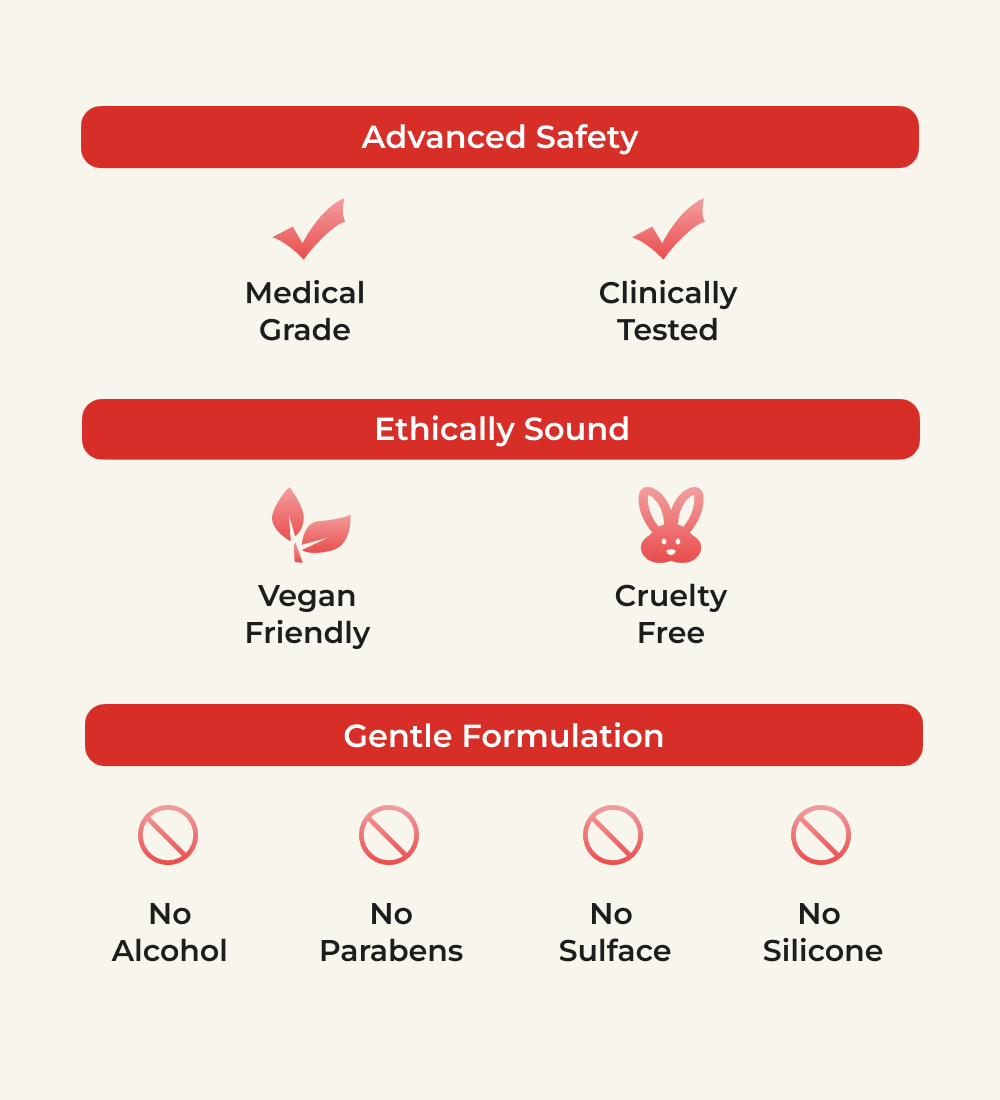 Medical-grade quality, vegan-friendly, and cruelty-free. Free from sulfates, phthalates, parabens, silicones, artificial colors, and alcohol.